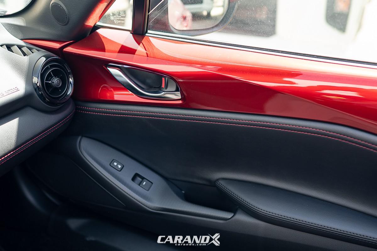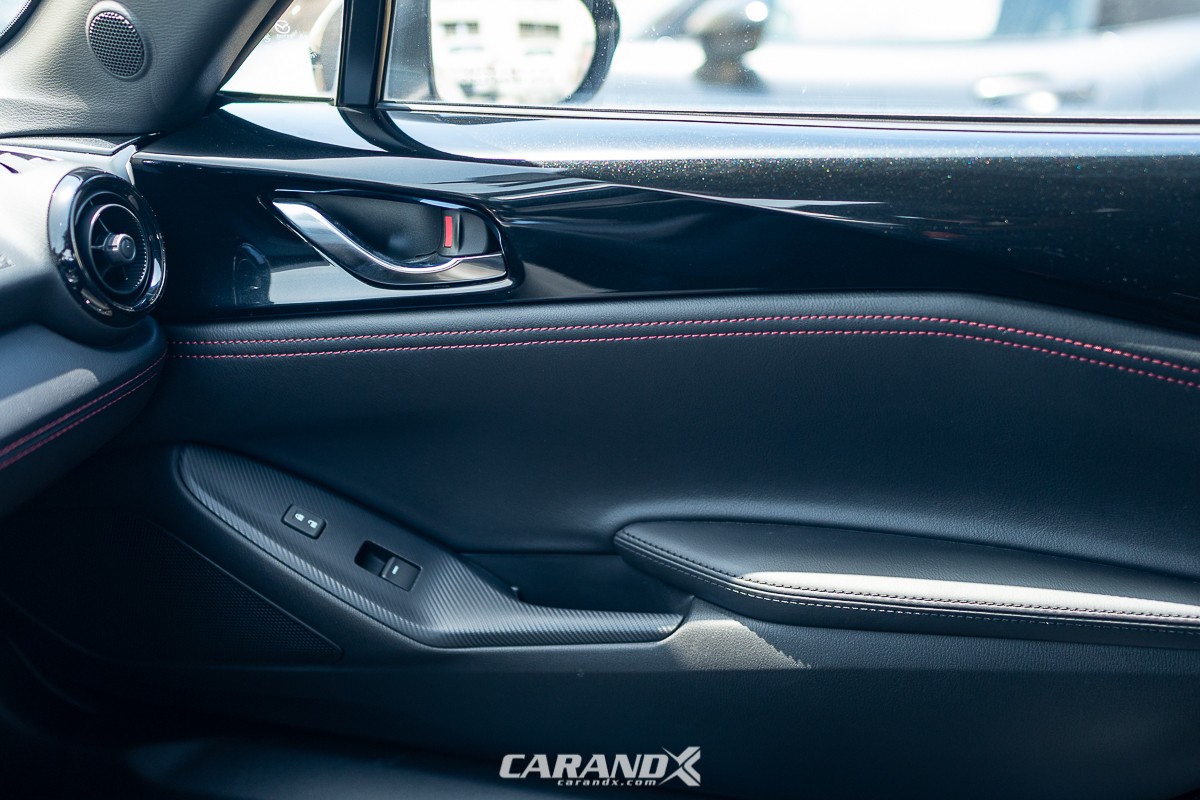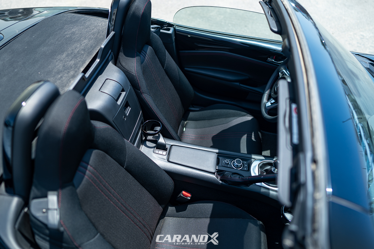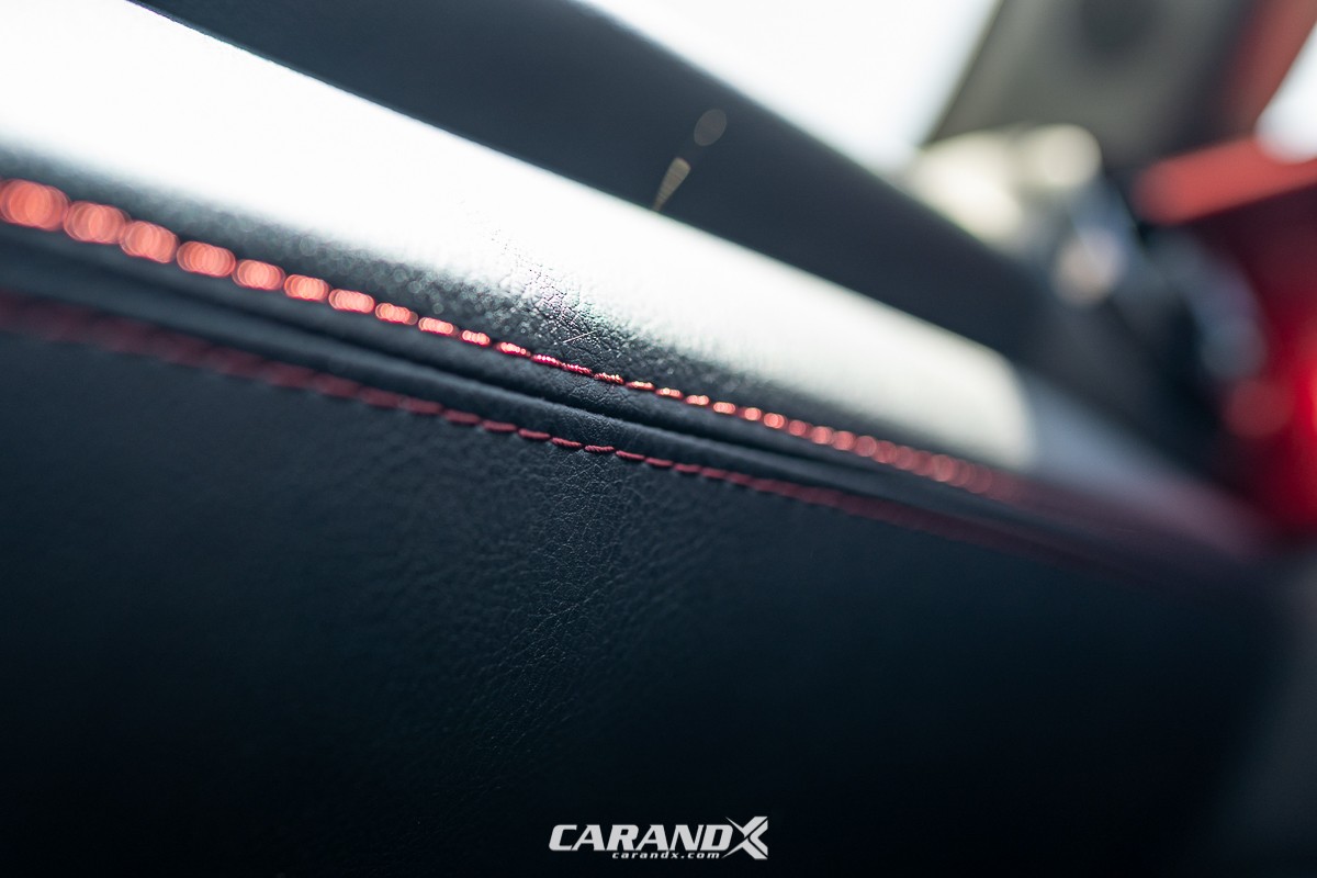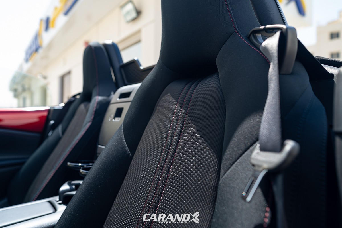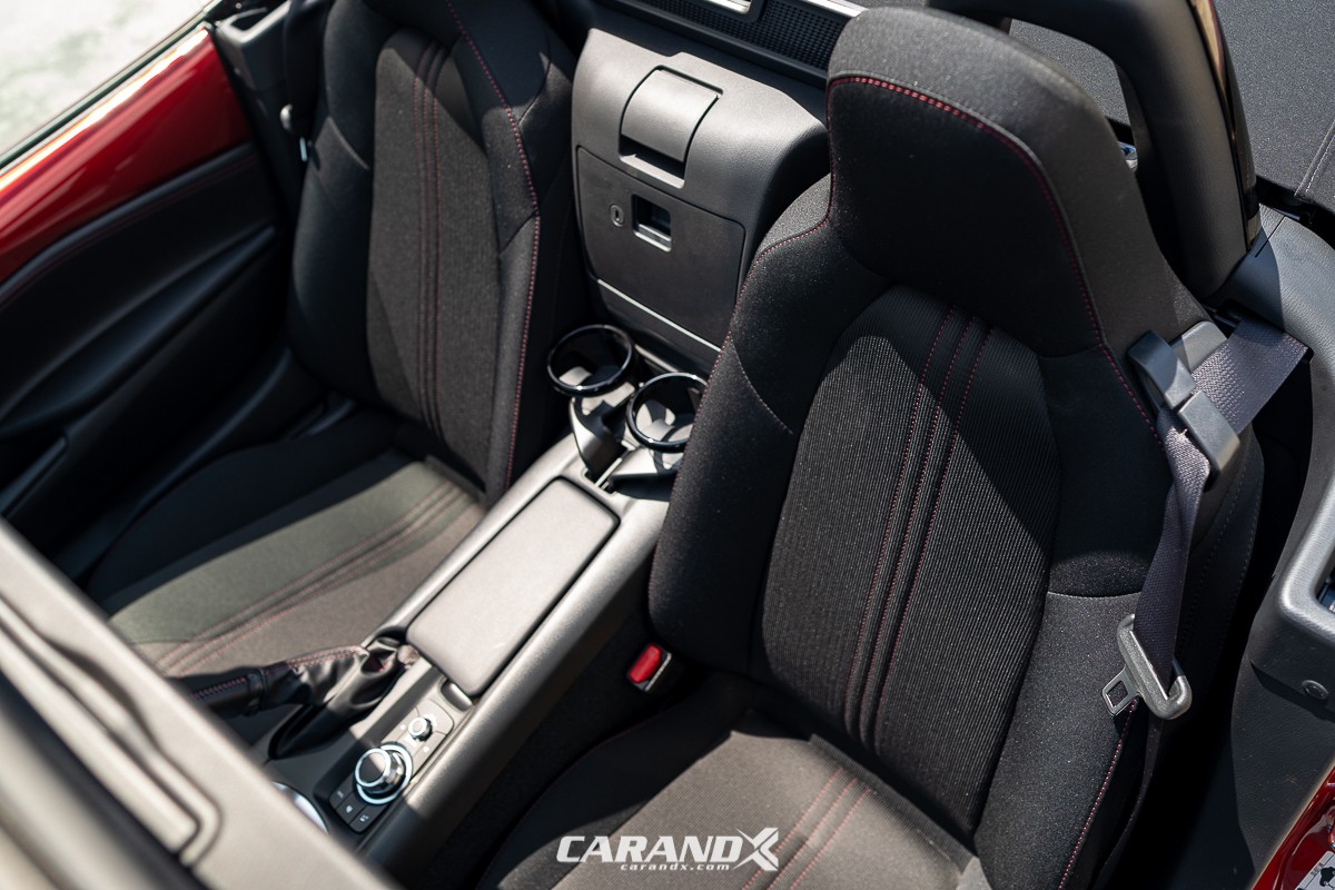 | Seat Material | : | Black cloth upholstery with red stitching |